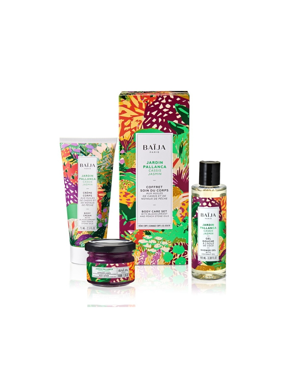 Body ritual lift set Jardin Pallanca contenente lo Scrub, gel doccia e crema corpo in formato viaggio, caratterizzati da una gioiosa fragranza Ribes Nero e Gelsomino per formulazioni dalla ricca base botanica. L’olio di Cocco arricchisce il detergente; lo scrub dolce-salato sfrutta Zucchero, Sale Marino e Oli Vegetali; la crema corpo si avvale di un sensoriale blend a base di Olio di Ribes Nero, di Nocciolo di Pesca ed Esteri di Jojoba. Tutte le formulazioni sono racchiuse in raffinate confezione contengono oltre il 96% di ingredienti naturali tra cui olio di Ribes Nero, olio di Nocciolo di Pesca, estratto di Karité. HAPPY & NATURAL