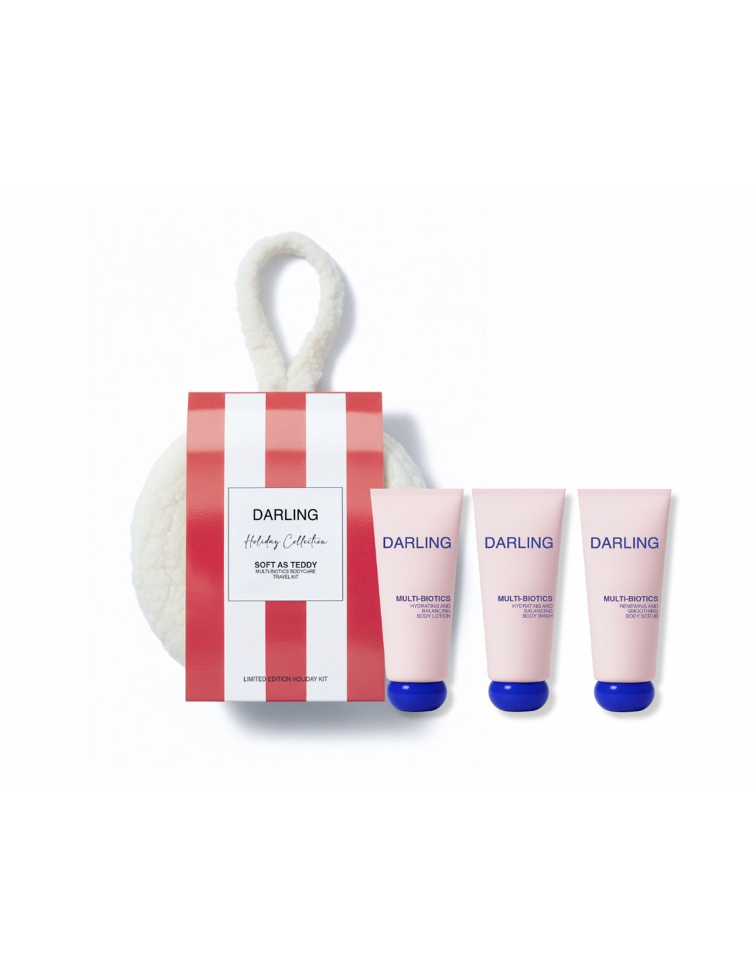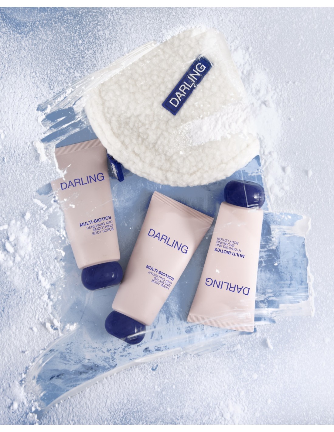 Questo kit in edizione limitata racchiude l’intera body routine Multi-Biotics di Darling in pratici formati travel, custoditi in una morbidissima pochette effetto teddy che vorrai portare ovunque. Arricchiti con prebiotici e probiotici, tutti i prodotti sono studiati per idratare, riequilibrare e proteggere la barriera cutanea, lasciando la pelle morbida, setosa e coccolata… dalla testa ai piedi.