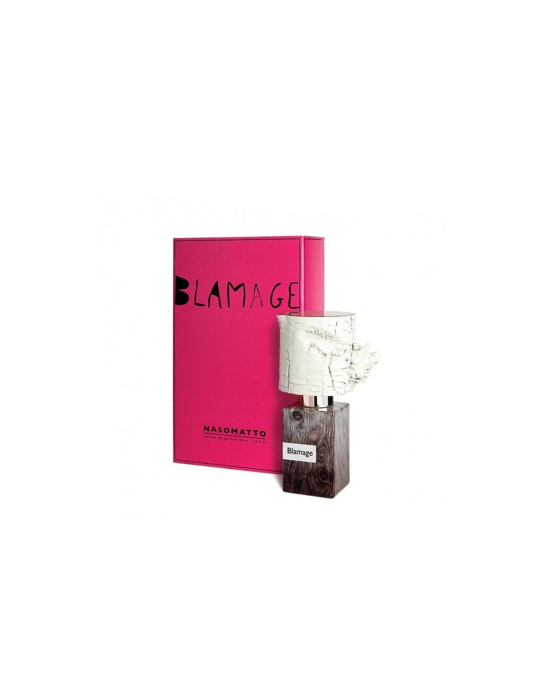 Inspired by all that is unconditional, the packaging is itself a message and an invitation to trial. Blamage's bottle cap is made of white lacquered hazel wood. The shape and size of the caps may differ, emphasizing the imperfections and uniqueness of nature. As with all Nasomatto fragrances, the packaging was made entirely in Italy.