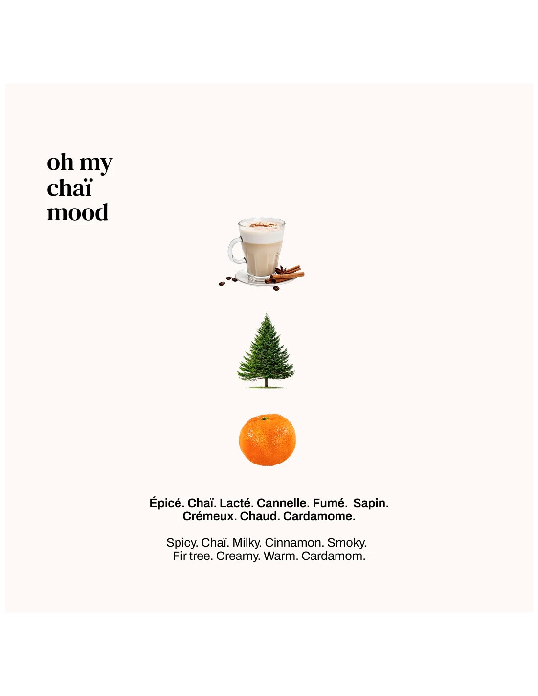 Piramide Olfattiva Note di Testa: Cardamomo, Cannella, Clementina Note di Cuore: Latte, Spezie calde, Accenti affumicati Note di Fondo: Abete resinato, Muschi cremosi, Calore avvolgente (Note fornite: Piccante, Chai, Latte, Cannella, Affumicato, Abete, Cremoso, Calore, Cardamomo) Carattere & Atmosfera ✨ Speziato – Cremoso – Affumicato – Avvolgente – Natalizio Un chai latte accanto al camino, tra musica, luci e magia.